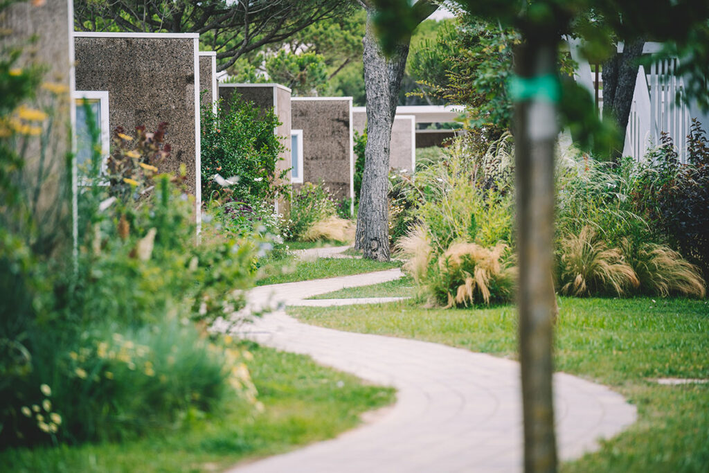 L’oasi frontemare si affaccia sulla sabbia dorata del litorale di Jesolo. In questa zona la progettazione paesaggistica modella la sabbia dorata del territorio con linee curve e morbide, per creare dune artificiali sulle quali arbusti, graminacee ornamentali ed erbacee perenni ricreano i colori e il movimento delle dune costiere, muovendosi con naturalezza al soffiare del vento e ondeggiando insieme alle farfalle bianche fissate su steli di acciaio armonico inserite tra le dune. L’installazione “Flight of wings” curata da Simona M. Favrin con e-gardening si sviluppa sulle dune che proteggono e accolgono le bellissime terrazze delle nuove Mobile Homes frontemare.
