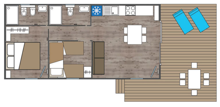 Questa mobile home Aqualux si sviluppa su 40 mq e può ospitare comodamente fino a sei persone.
