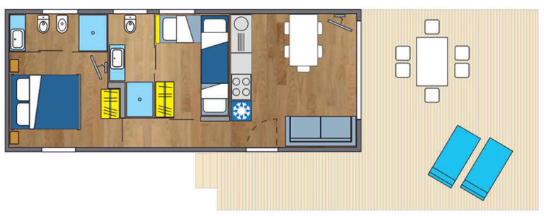 Questa mobile home Aqualux si sviluppa su 40 mq e può ospitare comodamente fino a sei persone.