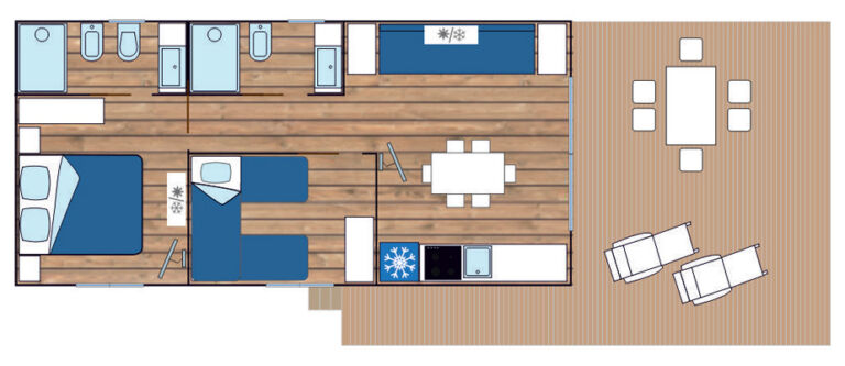 Questa mobile home Aquatica si sviluppa su 40 mq e può ospitare comodamente fino a sei persone.