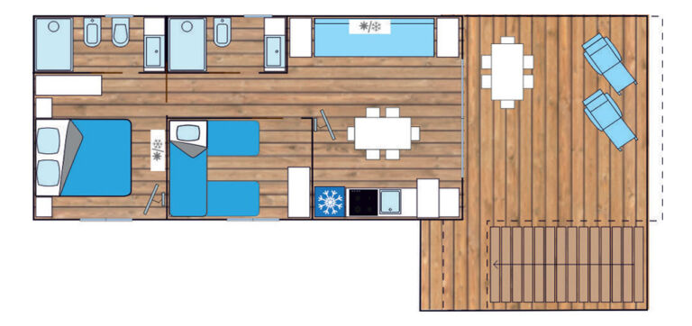 Situata fronte mare, la mobile home Aquavista si sviluppa su 40 mq e può ospitare comodamente fino a sei persone.