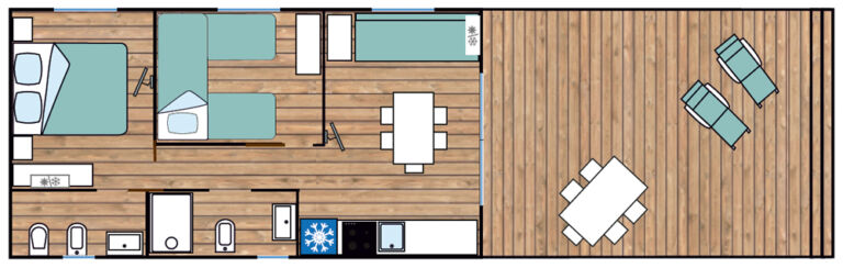 La mobile home Aquolina si sviluppa su 32 mq e può ospitare comodamente fino a sei persone, risultando ideale per famiglie o piccoli gruppi in cerca di comfort e funzionalità.