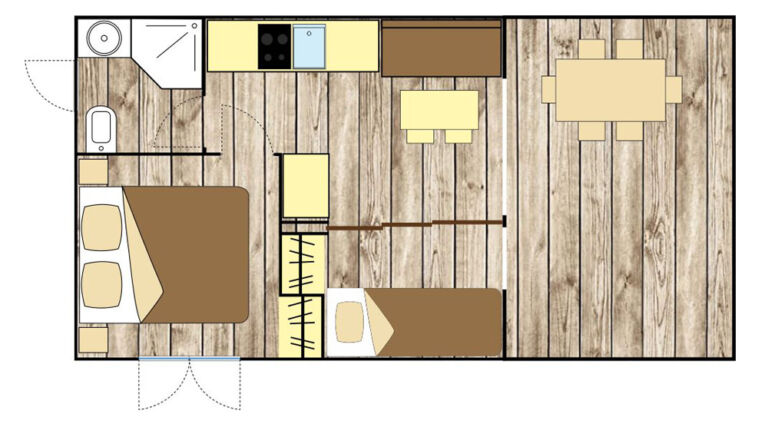 La mobile home Cabana si sviluppa su 21 mq ed è una soluzione funzionale e luminosa, caratterizzata da una grande vetrata nel soggiorno che favorisce la continuità tra spazi interni ed esterni.