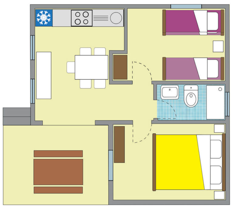 Lo Chalet Brick si sviluppa su 40 mq e può ospitare comodamente fino a cinque persone. La sistemazione dispone di una camera matrimoniale e di una seconda camera con un letto singolo e un letto a castello.