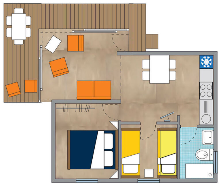 Il Cottage Living Plus si sviluppa su 43 mq, con una terrazza integrata di 20 mq, arredata e dotata di cancelletto, ideale per soggiorni comodi e rilassanti per tutta la famiglia.