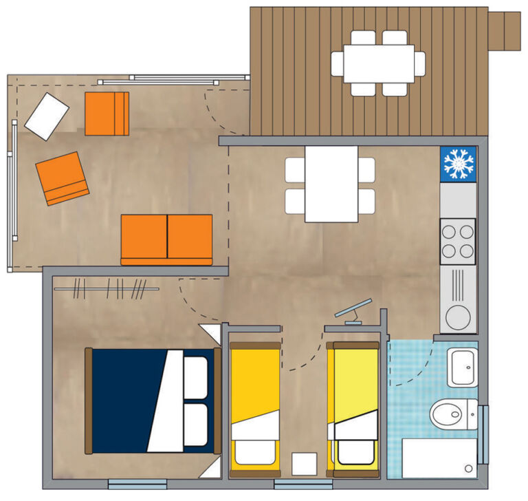 Il Cottage si sviluppa su 43 mq, con una terrazza integrata di 12 mq e può ospitare fino a sei persone
