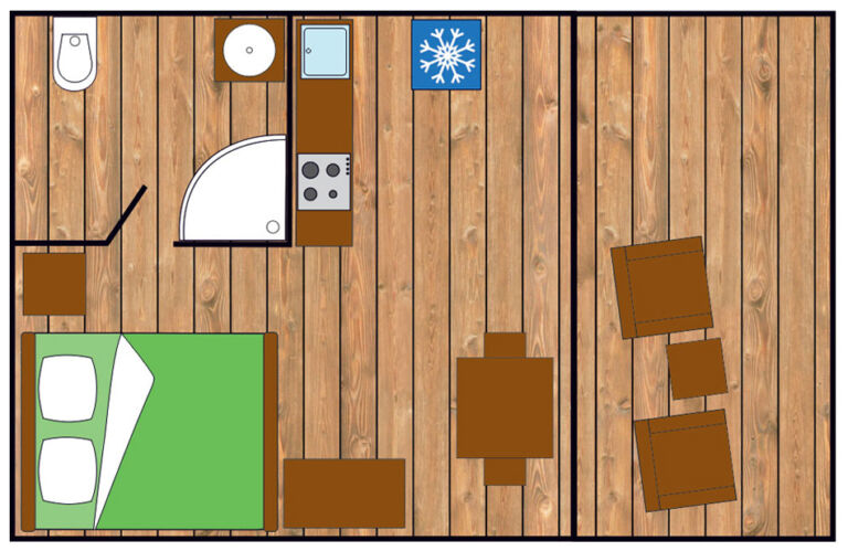 La tenda Glamping Suite si sviluppa su 28 mq, comprensivi di area esterna coperta, arredata con tavolino e poltroncine, ed è una soluzione compatta e funzionale per il soggiorno open air.