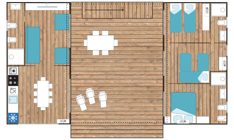 Si sviluppa su 64 mq, suddivisi in due moduli abitativi di 32 mq ciascuno, affiancati e collegati da una spaziosa terrazza su due livelli: una terrazza coperta di 48 mq arredata con tavolo e sedie e un solarium sopraelevato di 55 mq dotato di lettini prendisole, poltroncine e tavolino.